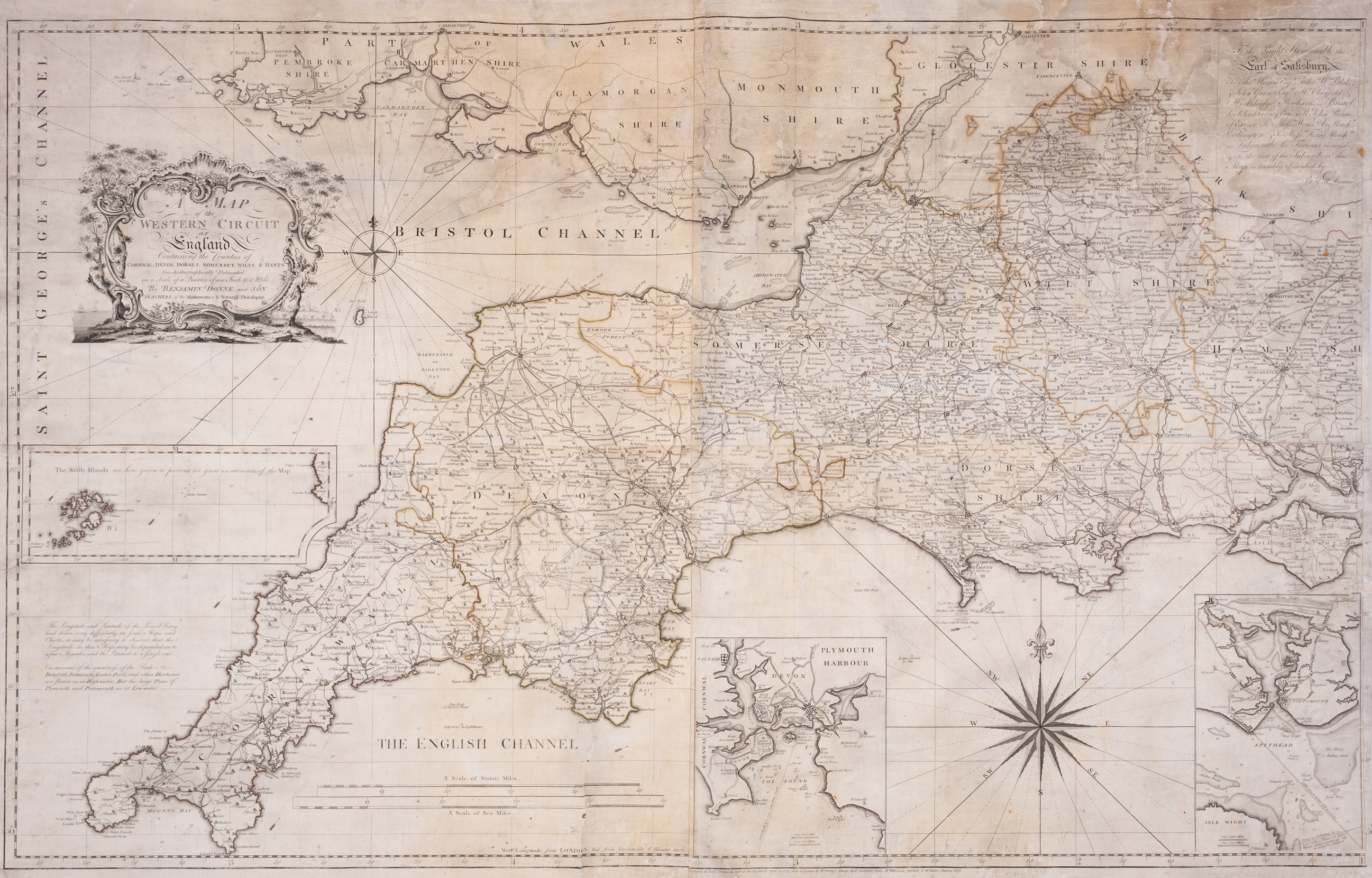 This map covers Cornwall, Devon, Dorset, Wilts & Hants and measures 830 x 1340 mm. Dedicated to the Earl of Salisbury (and others) it includes inset maps of Plymouth and Portsmouth harbours and the Scillies. A copy came up for auction recently and the hammer went down at 2000 pounds. It is probably on sale at a London dealer´s for double!!